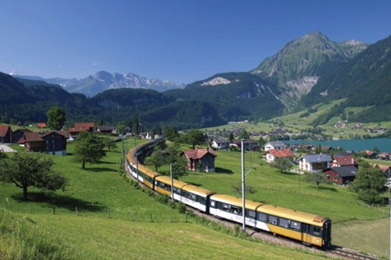 流線外型的車廂設計,火車穿越葡萄園,沿途優美的瑞士山岳景緻和傳統阿爾卑斯木屋,掛著牛鈴的牛群在綠油油山坡吃草,一景一物都像是ㄧ幅幅風景畫呈現在眼前